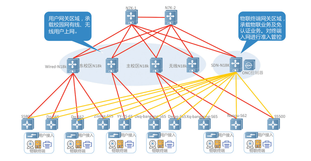對于業(yè)務(wù)相對獨立,設(shè)備數(shù)量眾多的物聯(lián)網(wǎng)設(shè)備,可以組建一張物聯(lián)網(wǎng)專網(wǎng)。如宿舍的智能門禁系統(tǒng),智能門禁設(shè)備數(shù)量眾多,但這些智能門禁設(shè)備都只需要訪問一臺門禁服務(wù)器。如果讓這些設(shè)備單獨入網(wǎng),暴露在校園網(wǎng)中,假如這些設(shè)備有安全漏洞,學(xué)生宿舍將存在安全隱患。但如果通過光纖將這些設(shè)備組成物理專網(wǎng),又會推高施工成本。另外,如果專網(wǎng)數(shù)量越建越多,還會產(chǎn)生管理復(fù)雜的問題。