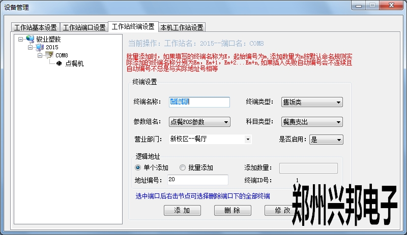 工作站終端設(shè)置:在端口地址下添加終端,進行添加時填寫終端名稱,選擇終端類型、參數(shù)組名、科目類型、營業(yè)部門,是否啟用選擇是,添加地址時可以選擇單個添加和批量添加。此地址編號要與機器的編號相同。進行批量添加時填寫添加數(shù)量、地址號,點擊添加后就可以以地址號遞增的形式添加機器。選中終端可以進行修改和刪除操作,選擇端口右擊可以刪除端口下的所有終端。