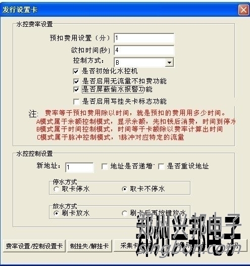 2、在水控費率設(shè)置里面,預(yù)扣費用設(shè)置寫1,預(yù)扣時間寫4,控制方式選擇B,按下圖來設(shè)。然后制一張費率設(shè)置卡。