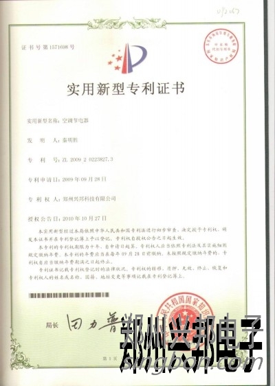 興邦電子空調(diào)節(jié)電器專利證書(shū)