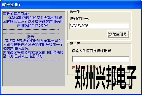 軟件安裝完成后有一個月的試用期,當過了試用期后軟件就打不開了,所以在試用期結束前就要注冊軟件,軟件注冊時首先在軟件的幫助-軟件注冊中獲取一個注冊號,如下圖所示,把獲取到的注冊號發(fā)到公司,公司會提供一個注冊碼,把注冊碼復雜粘貼到第二步的注冊碼中,點擊注冊就可以了。如果軟件已經過期獲取不到注冊號,那么就要通過一個小插件獲取注冊號,在插件上進行注冊就可以了。