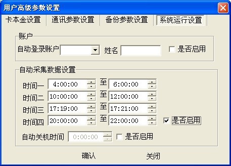 485一卡通軟件可以設(shè)置消費(fèi)數(shù)據(jù)定時(shí)采集,如下圖所示,在用戶高級(jí)參數(shù)設(shè)置-系統(tǒng)運(yùn)行設(shè)置中有一個(gè)自動(dòng)采集數(shù)據(jù)設(shè)置,最多可以設(shè)置四個(gè)自動(dòng)采集的時(shí)間段,時(shí)間段設(shè)置時(shí)不能跨天,且后一個(gè)時(shí)間段的開始時(shí)間不能大于前一時(shí)間段的結(jié)束時(shí)間,設(shè)置完成后勾選上是否啟用,點(diǎn)擊確認(rèn)即可,如果沒有勾選上是否啟用,代表自動(dòng)采集數(shù)據(jù)設(shè)置不起作用。