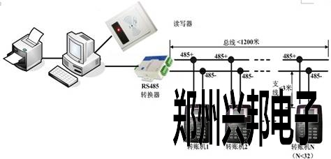 采用485通訊方式,如圖:485通訊須要自助轉(zhuǎn)賬機與電腦之間連線、距離不能超過1200米,自助轉(zhuǎn)賬機可以設在充值點旁邊,或食堂內(nèi)。