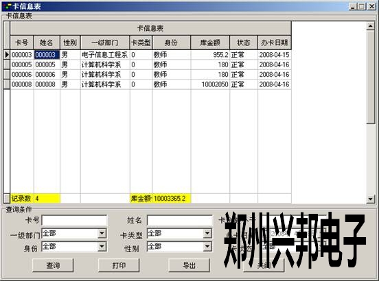 卡信息表主要用于查看卡的基本信息??梢赃x擇相應(yīng)的條件,然后單擊【查詢】在表格中會出現(xiàn)相應(yīng)條件的卡的基本信息,表的最下面顯示出所查詢出的總記錄數(shù)及庫金額匯總。