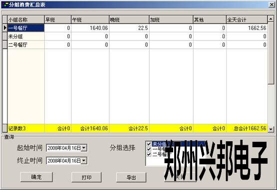 根據(jù)時間查詢出每組機(jī)器在每個時間段和所有時間段的消費匯總情況,此表一般在給餐廳結(jié)帳時使用。