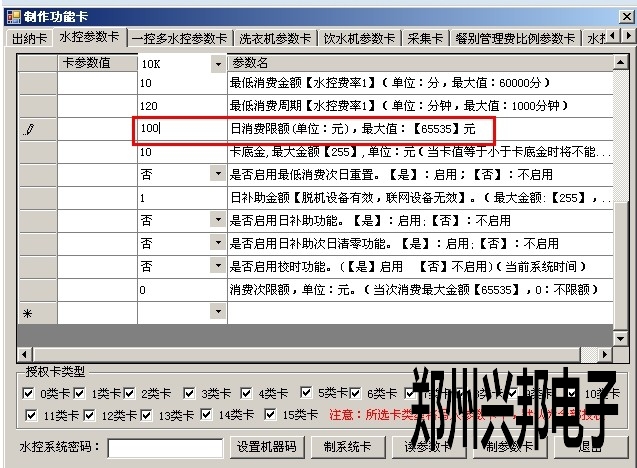 2)打開軟件 制卡中心-功能卡制作-水控參數(shù)卡中的日限額,輸入要設(shè)置的值,以元為單位,如下圖所示,代表100元,最大可設(shè)置到65535元,設(shè)置好后點(diǎn)擊制參數(shù)卡即可;