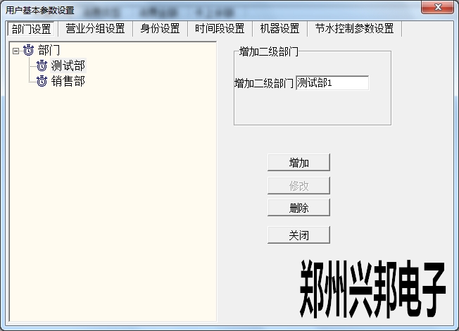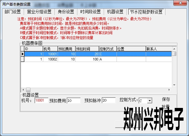 在使用興邦一卡通平臺用戶基本參數(shù)設置中有部門設置、營業(yè)分組設置、身份設置、時間段設置、機器設置、節(jié)水控制參數(shù)設置。下面依次為其說明。