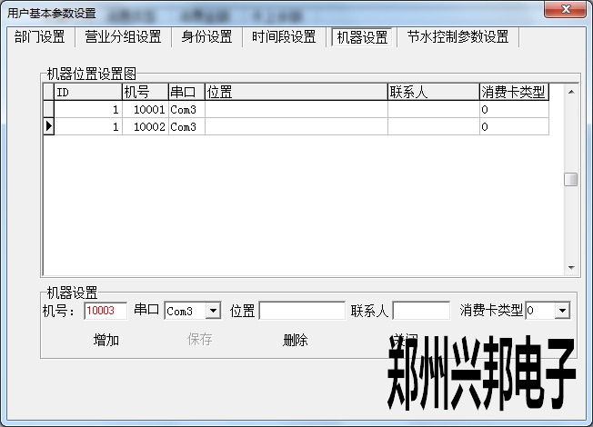 在機器設置中可以添加機器,設置機器號、串口以及消費卡類型,位置、聯(lián)系人可以選填。其中設置機器號必須輸入5位,開頭為1,最大可設置為19999.串口是指通訊器連接電腦的端口號,此處的串口號選擇不正確的話會導致機器不通訊。