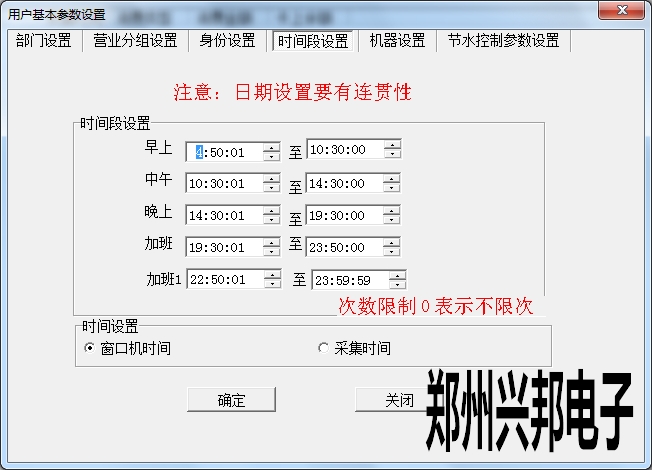 時間段設置是為了方便統(tǒng)計不同時間段餐別的消費情況。在設置時設置每個時間段之間不能交叉,不能跨天,時間由小到大進行設置。另外可以選擇窗口機時間和采集時間進行時間設置。窗口機時間是按照在機器上刷卡時形成消費記錄的時間;采集時間是按照機器聯(lián)機進行數(shù)據采集上傳的時間形成消費記錄的時間。點擊確定即設置成功。