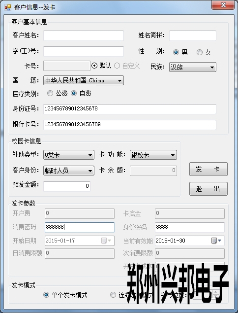 單個(gè)發(fā)卡是現(xiàn)將基本信息填寫完成后將卡片放在讀卡器上直接進(jìn)行發(fā)卡。有單個(gè)發(fā)卡模式和連續(xù)發(fā)卡模式兩種發(fā)卡模式。