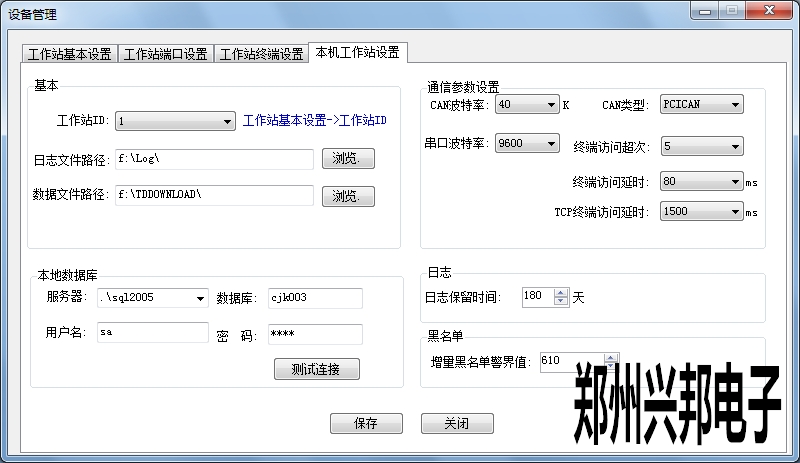本機工作站設(shè)置:工作站ID即選擇工作站基本設(shè)置中添加工作站的ID號,下面選擇存放日志文件和數(shù)據(jù)文件的地址;通訊參數(shù)設(shè)置中CAN波特率默認為40K,串口波特率默認為9600,此處設(shè)置不對會導致機器不通訊。終端訪問超次從1到100,默認為5,終端訪問延時從10ms到6000ms,默認為20ms,此處設(shè)置會影響監(jiān)控平臺下載參數(shù)和上傳記錄的速度,一般使用默認值;本地數(shù)據(jù)庫設(shè)置中服務(wù)器選擇數(shù)據(jù)庫2005的服務(wù)器名,數(shù)據(jù)庫填寫創(chuàng)建采集庫的數(shù)據(jù)庫名稱,用戶名sa,密碼為hnzz,設(shè)置后點擊測試連接,看能否連通;日志保留時間和增量黑名單警界值可以自主更改。
