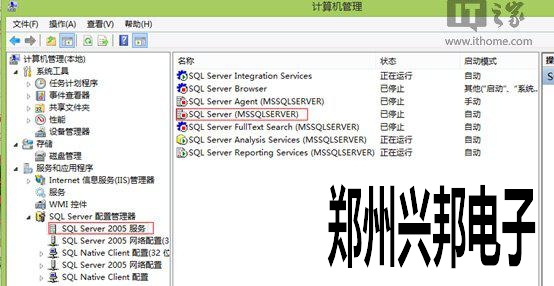 8、當(dāng)完成SQL Server 2005安裝后,先不啟動套件,而是先強制停止SQL Server的服務(wù)項目。(進入計算機管理,選擇SQL Server配置管理器,禁止SQL Server 2005相應(yīng)的服務(wù)項目)