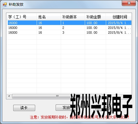 ? 首先點擊讀卡,讀卡后會按補助的版本號顯示出這張卡所有未領取的補助,領取過的不顯示,發(fā)放補助時,按照補助的版本號從小到大依次發(fā)放,發(fā)放的時候選中要發(fā)放的補助,然后點擊發(fā)放即可。