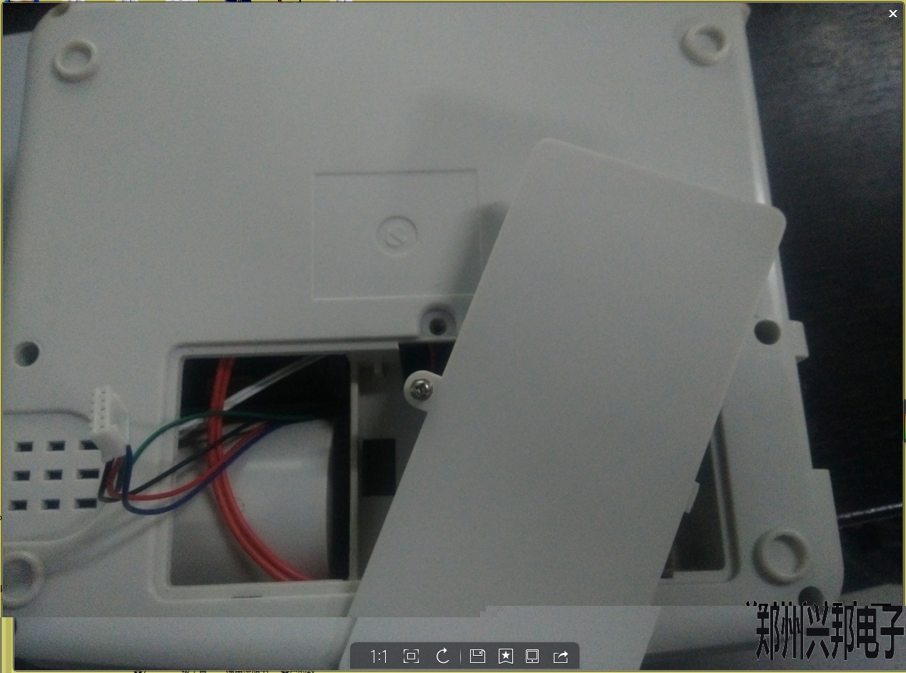 如圖1-1所示,打開機器背部電池蓋,小心去除小票打印機上邊插著的5p線。把線插到做好的升級工具線的5p插座上即可。