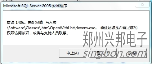 客戶使用我們的互聯(lián)網(wǎng)一卡通食堂售飯機,自己安裝SQL2005數(shù)據(jù)庫沒裝成功,讓我們遠(yuǎn)程再重裝一次,在控制面板里卸載后并刪除之前的安裝文件,又重新安裝時提示:錯誤1406。未能將值 寫入項\Software\Classes\.htm\OpenWithList\devenv.exe。請驗證您是否有足夠的權(quán)限訪問該項,或者與支持人員聯(lián)系。這時該怎樣解決呢?
