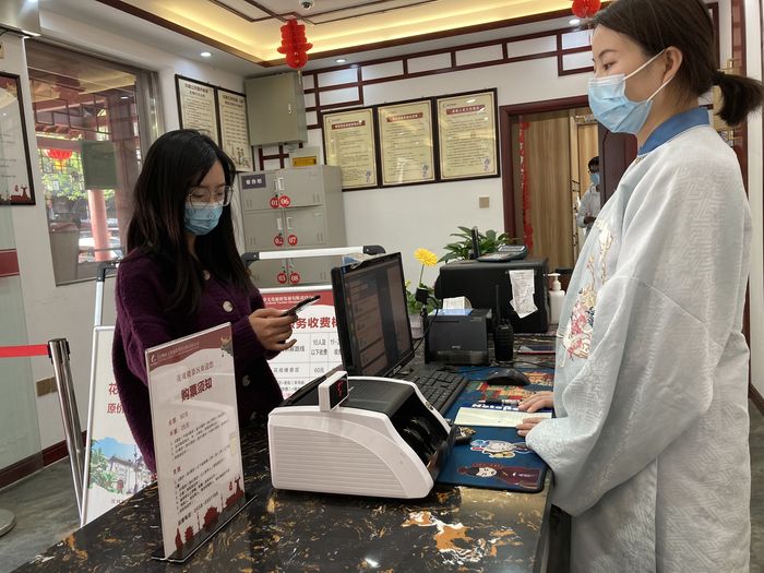 亳州市花戲樓景區(qū)售票處,江蘇游客正在刷社??ㄙ徺I門票。 劉景俠攝